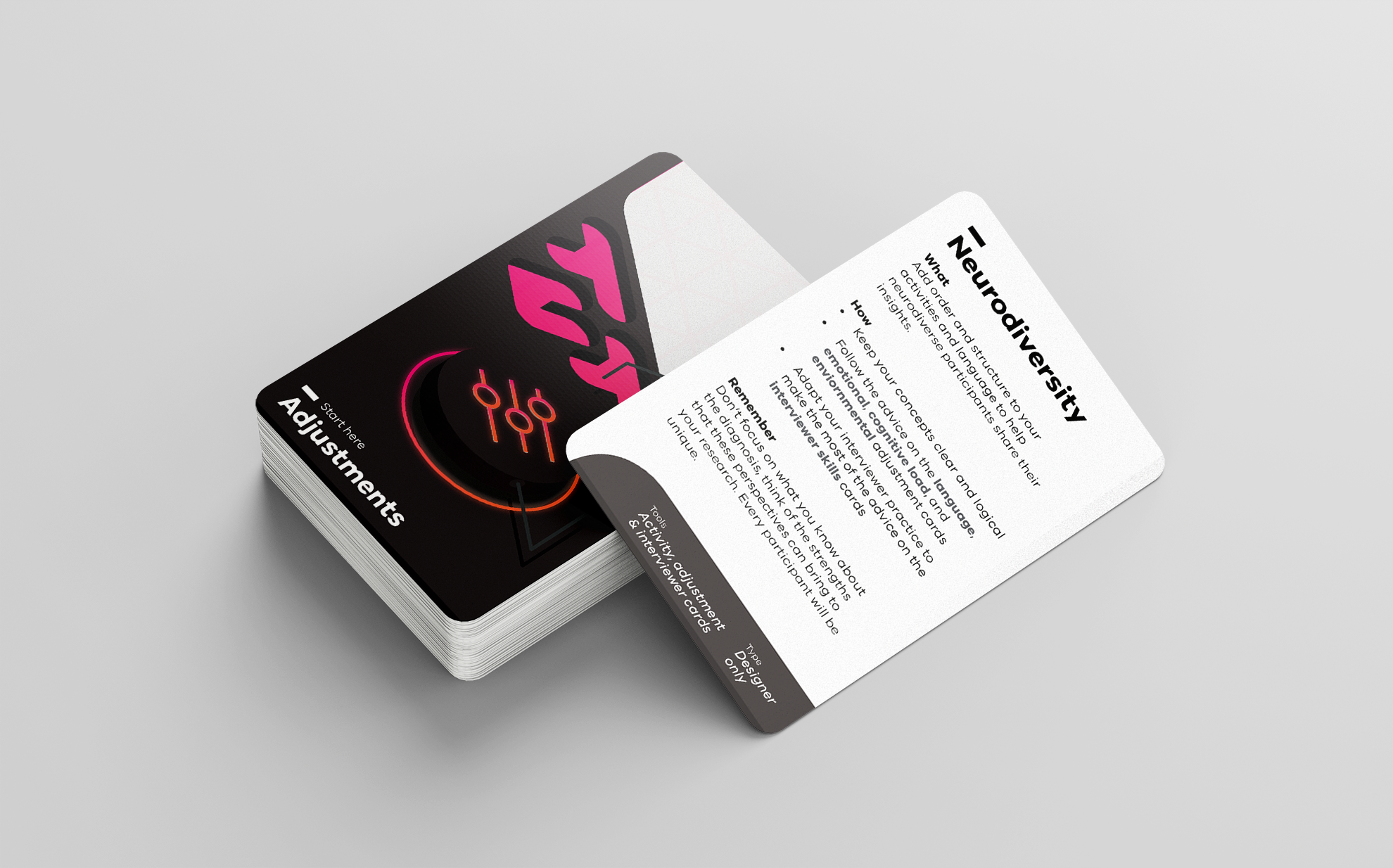 • methods designers can employ to work with and translate these insights into a tool for designers to embed inclusive adjustments into their user research practices.