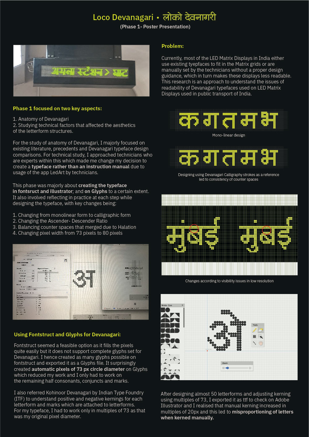 This practice-based research aims at understanding the readability issues of Devanagari typefaces used on LED Dot Matrix Displays in public transport of India and optimise its readability leading to effective communication. The research is approached through development of a Devanagari typeface to understand both aesthetic and technical aspects of the complex structure of Devanagari and maintain its design within the LED dot matrix systems.