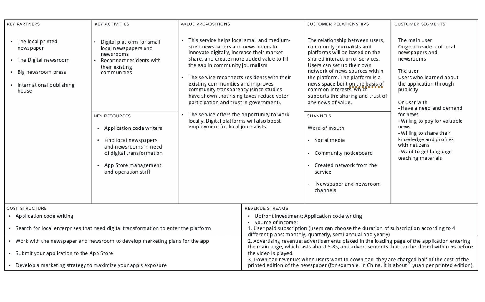 With the rapid development of information technology and the integration of media industry and Internet technology, the speed of news and information dissemination is getting faster and faster, and the scope of dissemination is getting wider and wider. This makes the local small and medium-sized newspapers suffer impact, facing transformation and upgrading. Small newsrooms across the country are shutting down because of the coronavirus. These smaller newsrooms are also actively looking for ways to make a difference by partnering with local publications, but this "merging" has led to the disappearance of community-focused reporting. This will reduce community transparency, and studies show that tax increases will reduce voter turnout. Therefore, I hope that through the transformation of successful enterprises, how to use digital innovation help local small and medium newspapers to expand business scale and scope of application of digital innovation, so as to improve the market share of the enterprise, create more added value, fill the blank of community news, and the construction of the digital platform will also promote the local reporters rising employment.
