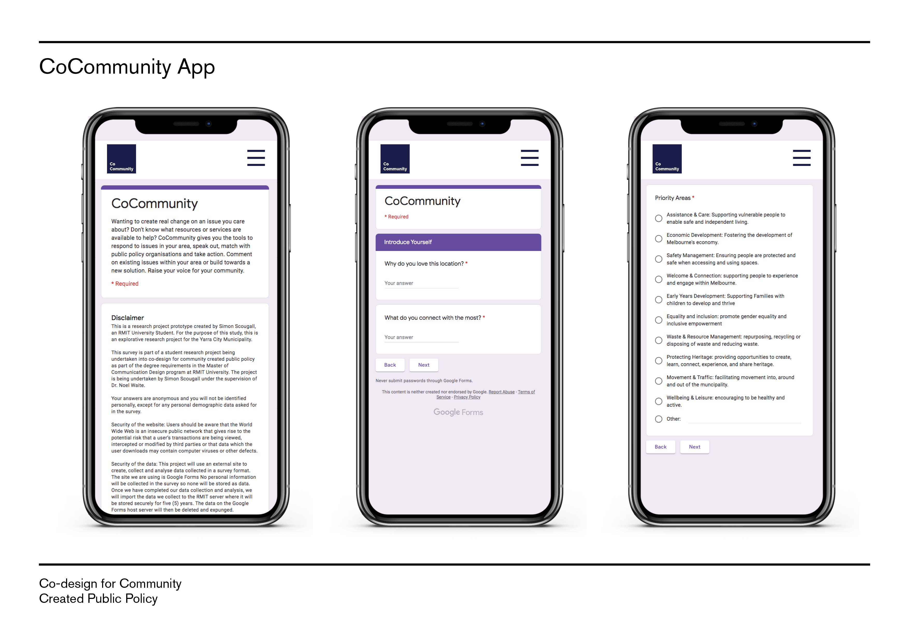 The outcomes presented, provides an effective guide of how policy-makers can use co-design, and the benefits of its use. The aim is to strengthen the ability of citizens and governments to solve public problems systematically, and provide opportunities and motivation to use innovative skills in future expanded practices. Replicating the processes and systems outlined within this report. opens the possibilities to use service design tools of place-based research, peer-to-peer data exchange, and participatory design in this industry.