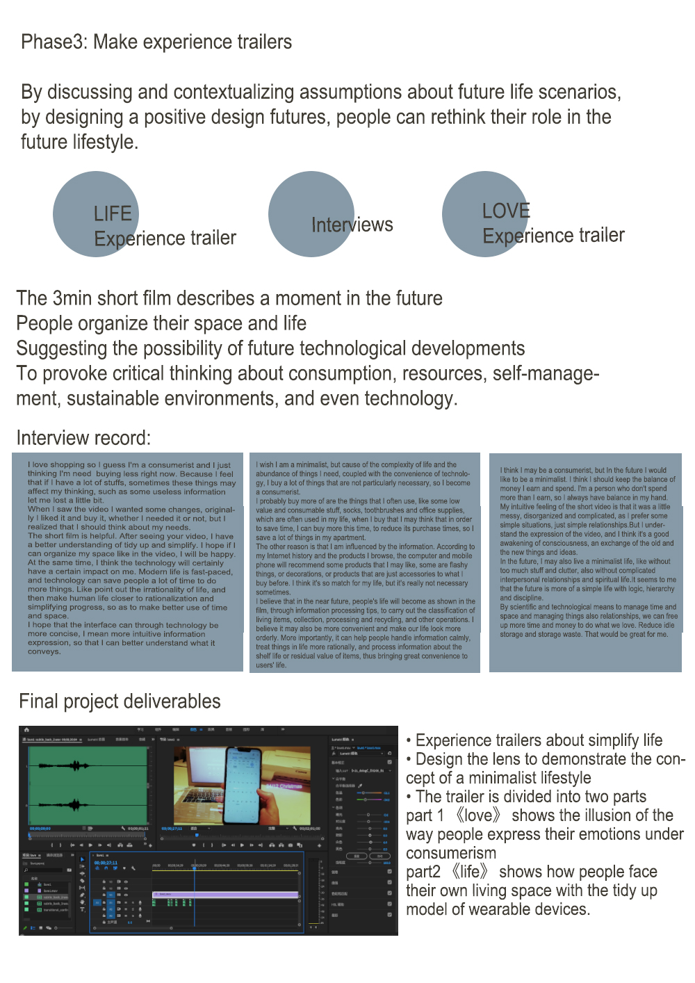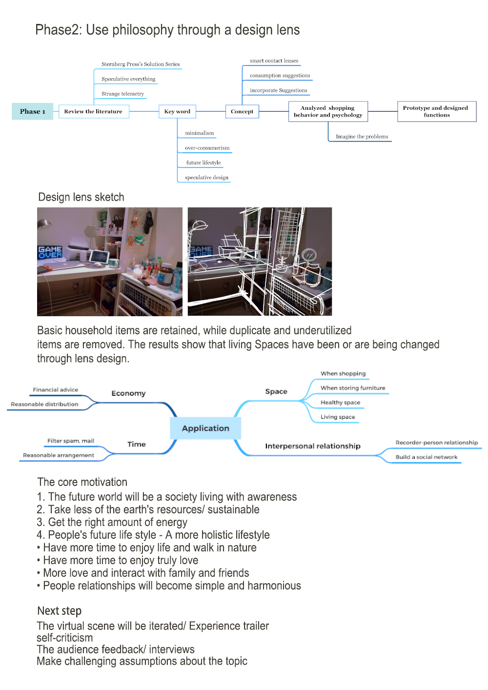 This research project is intended to provide preliminary support for the exploration of future links between speculative design and modern lifestyle. In contemporary cities, the fast pace of life and the rapid elimination of materials make people increasingly towards excessive consumerism. However, with the help of new technology and new ideas, human beings have to rethink the theory that "less is more" and apply it to daily life. Viswanathan and George (2018) point out that consumerism in a market economy always promotes the idea that "more is better", which may lead to ecological overshoot. In this research project, minimalism will be pushed to a new way of life in the future. While minimalism is not a new concept, there is now plenty of evidence and resources to support the trend. The speculative design began to reflect on the conflict between human activity, economic development, and limited resources. And the success of technology derivative products needs the awakening of consumer consciousness. At the same time, this research project is reasonable speculation and exploration of the possibility of the minimalist lifestyle in the future, to reflect and discuss the relationship between human needs and consumption.Wright (2010) states that minimalism is a way of life that is re-prioritizing objects so that people can get rid of unnecessary things that do not add value to their lives - possessions, thoughts, relationships and activities. Hausen (2019) mentions minimalism shows that individuals in contemporary consumer culture can make their lives more meaningful and fulfilling by reducing consumption and focusing on intrinsic values. In the research process, this report discusses how speculative design can be used as a practice, and how speculative design can help people to rethink their future lifestyle. Besides, thinking about the role of human beings in the future lifestyle through design practice.