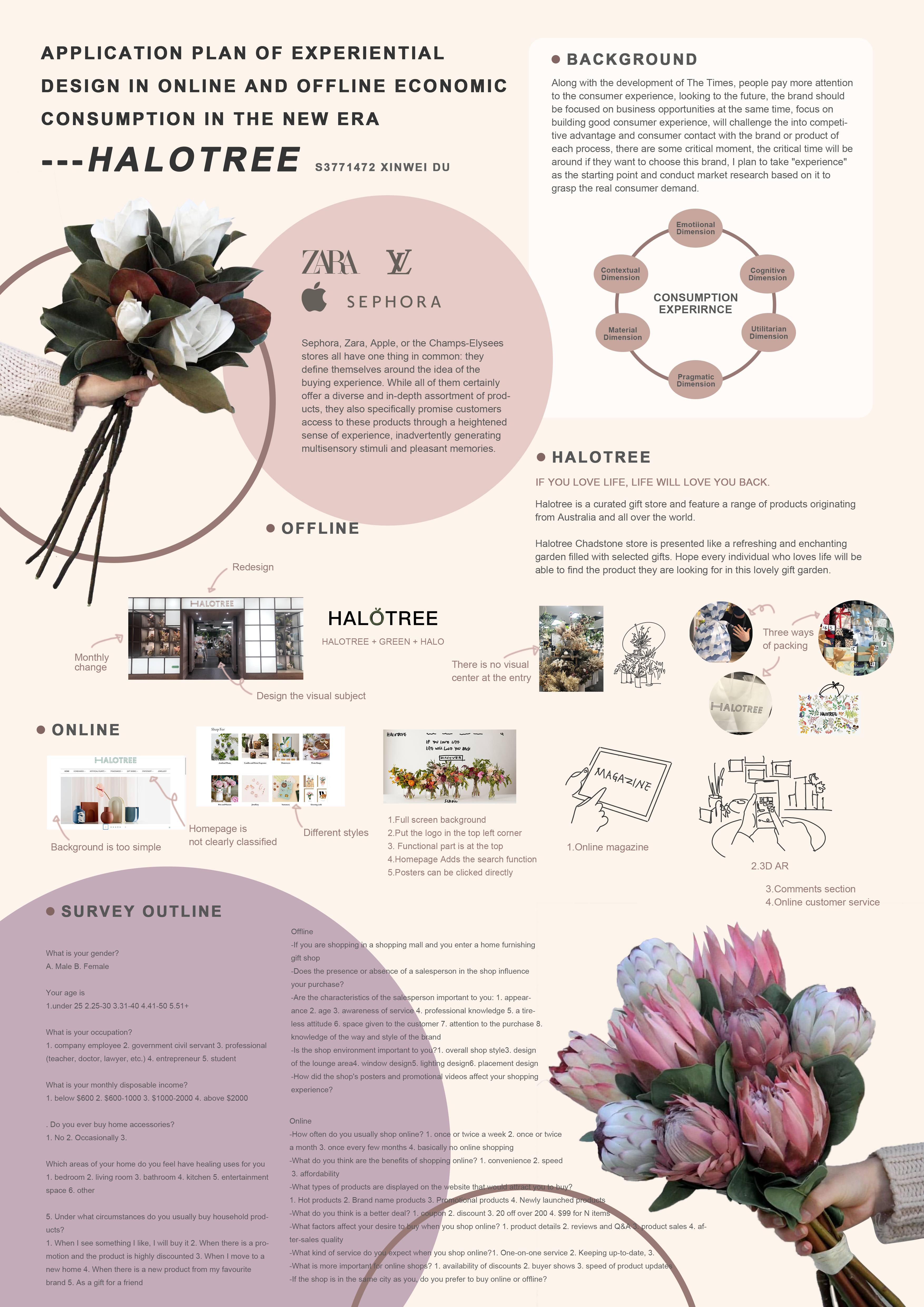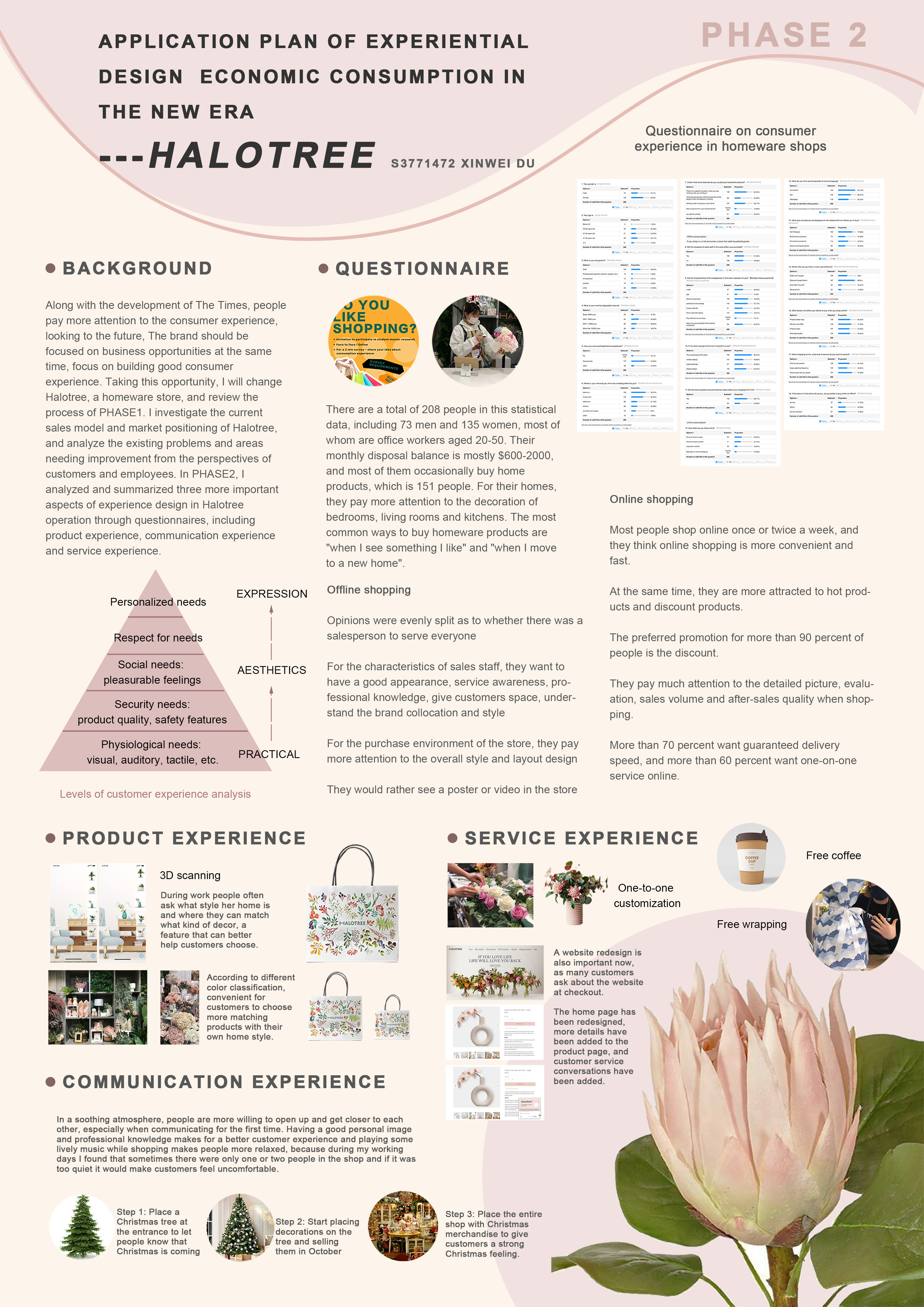 In recent years, consumers are demanding more and more from the 'home' in their homes. These consumers are also looking forward to life and organising and decorating their 'homes'. This project is a comprehensive, in-depth and systematic analysis of the experience design of Halotree in three stages, based on the transformation of the Melbourne 'Halotree' homeware shop. The first phase is the research phase, which will begin with researching the marketing model, service experience and product range of similar homeware shops, before going to Halotree to work one day a week to collect the problems that currently exist within the shop and suggest ideas for improvement. The second stage is the analysis stage, using some of the problems collected in combination with the questions that we want to understand to create a questionnaire, collecting the results through two different methods, online and offline, to draw conclusions and develop a sketch of the next plan. The third stage is the application stage, redesigning the shop space and going deeper into the sketches to improve the consumer experience in many ways.