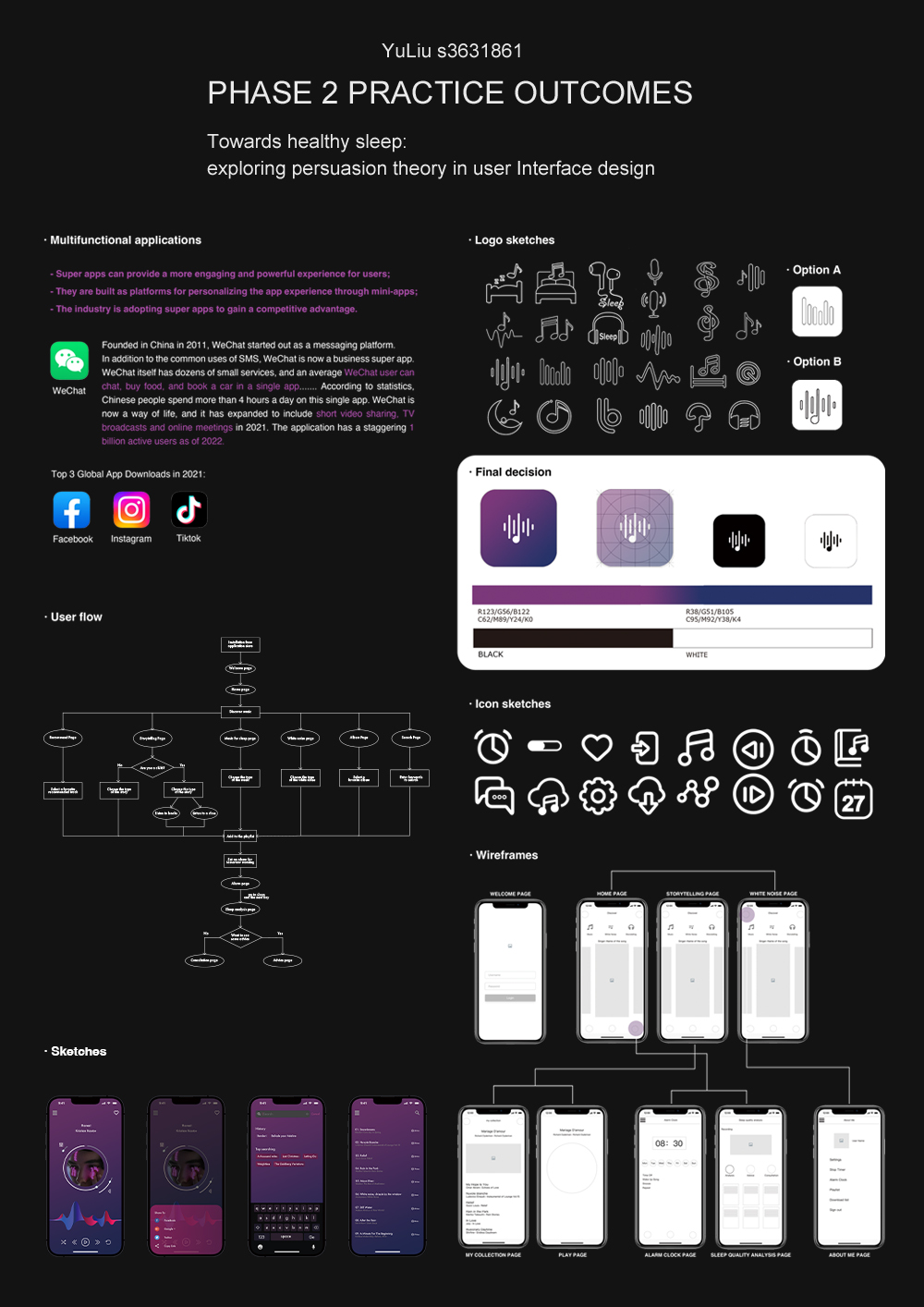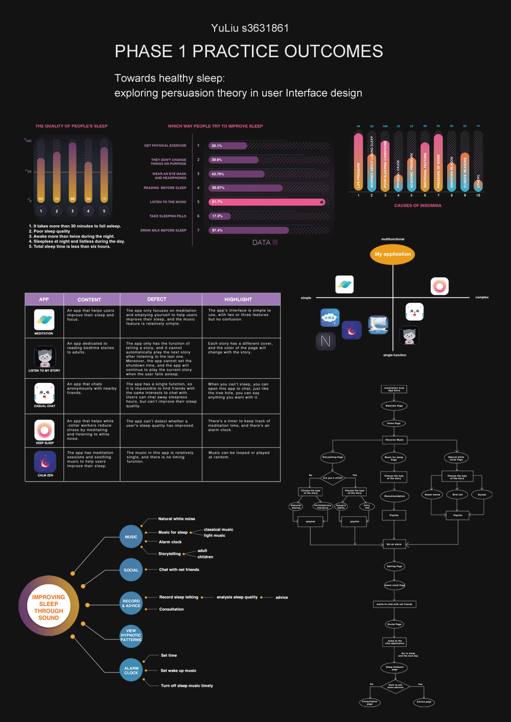 The main methods used in this project include literature research and qualitative research. Firstly, the origin and development of persuasion theory are sorted out, and secondly, the design practice of sleep management apps and their influence on people are sorted out. Through observation, statistical analysis of data and other ways to conduct multi-angle and all-round user research and market research, understand the causes behind sleep delay and sleep disorders, and find the design core of the project. In addition, as this project is essentially an interactive app design research on human behavior and psychology, which combines theory and reflective practice and is divided into three stages in an orderly manner, it will also involve human-centered design methods and reflective practice research methods.
