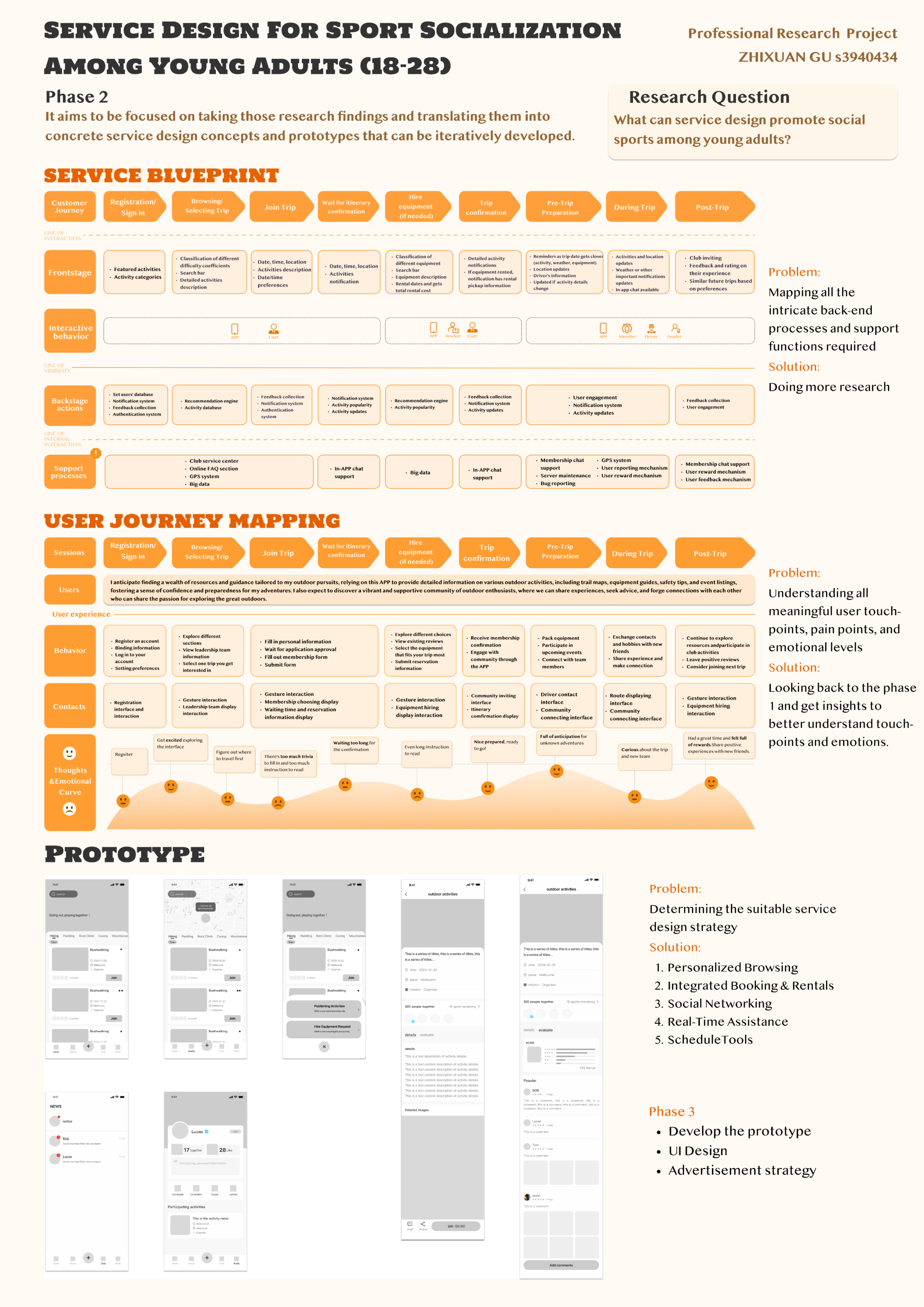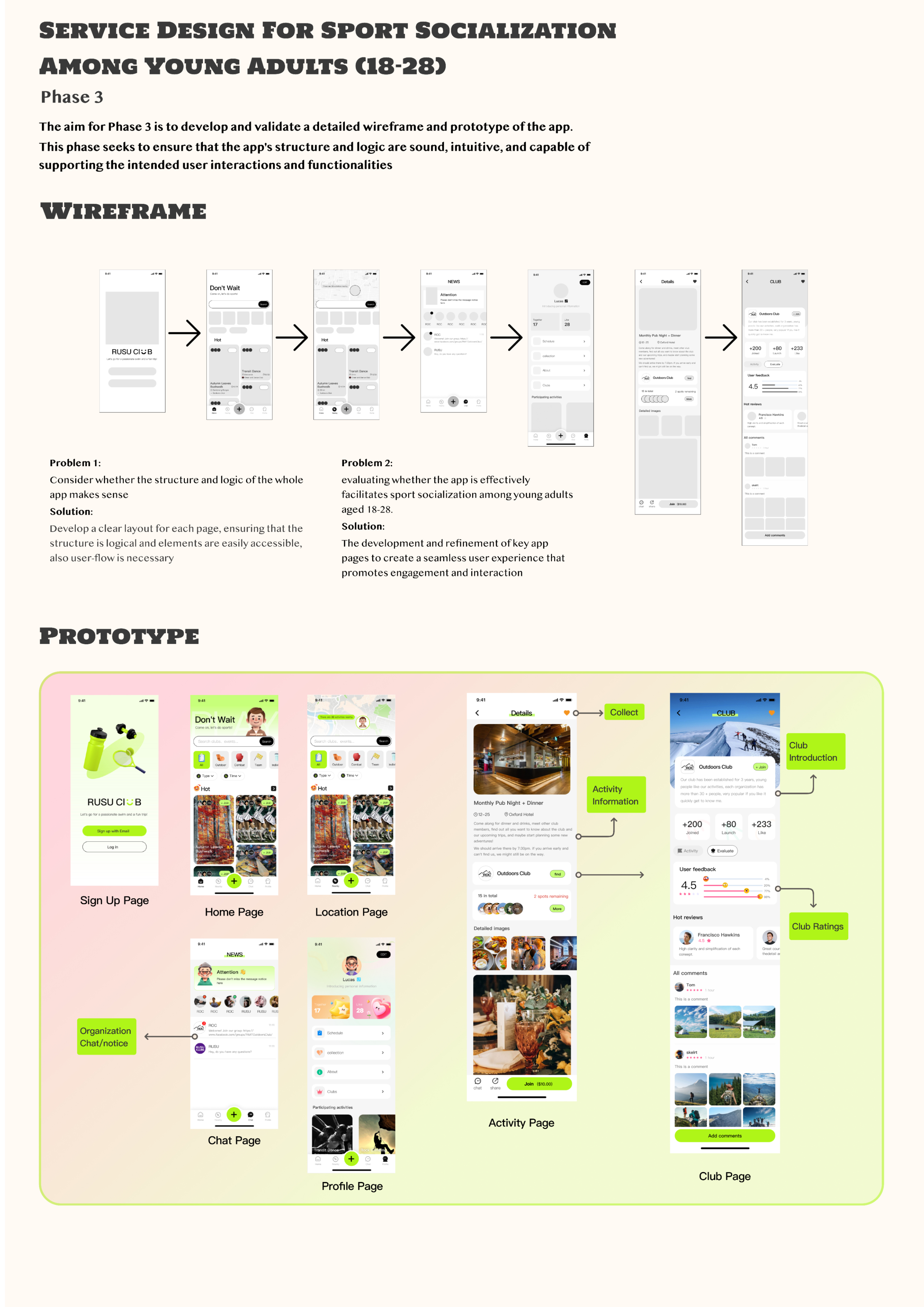 This study investigated how service design methodologies can be used to increase the engagement of young adults aged 18-28 in social sport and activities in university settings. Based on primary research, such as interviews, journey mapping, and iterations of the design process, significant insights were uncovered regarding desired experience, motivations, and barriers to participation. In response to these insights, an app was designed that features intuitive browsing for activities, integrated chat and club functionality, and a cohesive online/offline experience tailored to young adults' needs and preferences. Using sports as a means of enhancing community building and sustained engagement, service design was found to be an effective tool for improving community building and engagement. As a result of this project, young adults can build a sense of community, develop friendships, and engage in community activities.