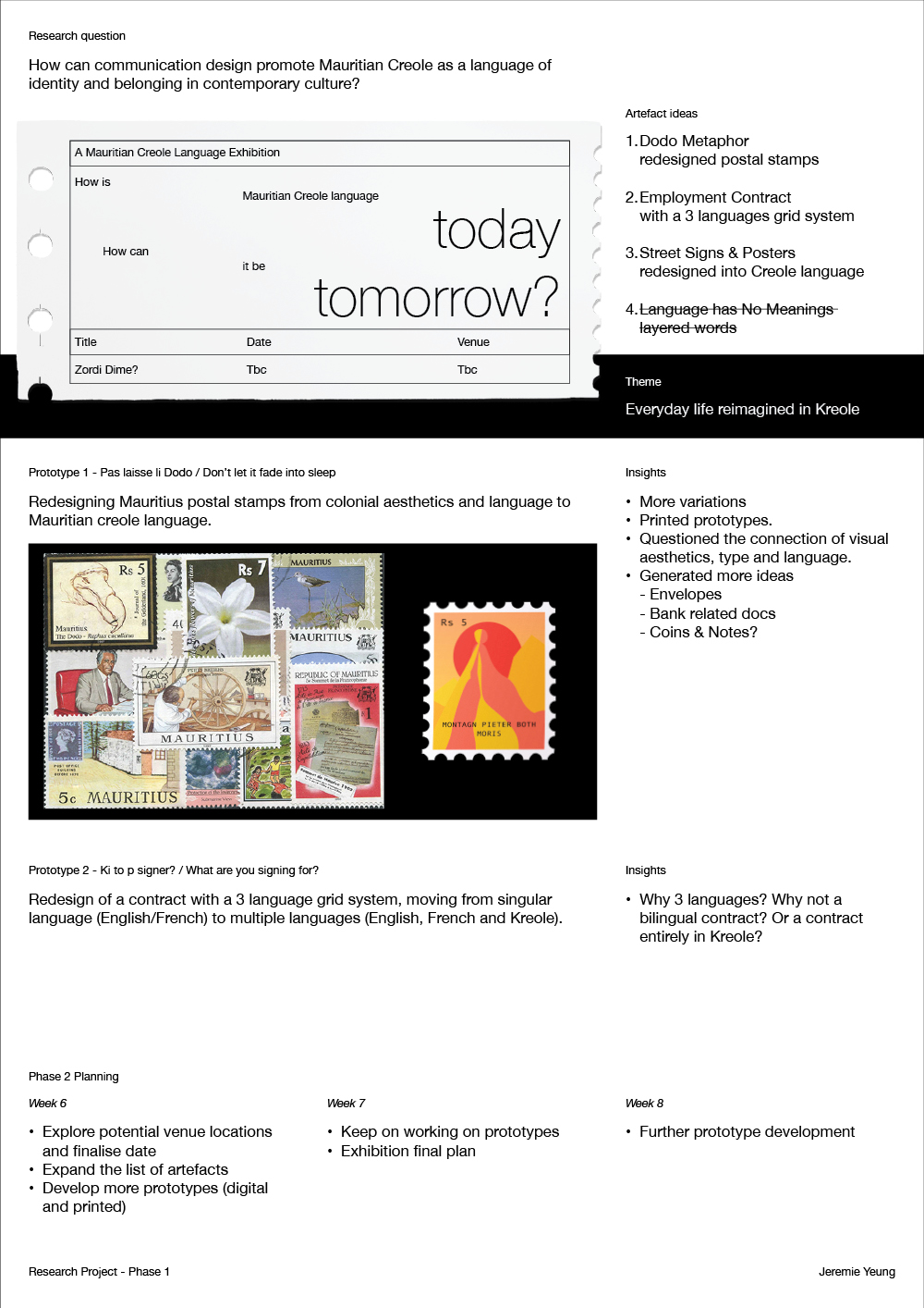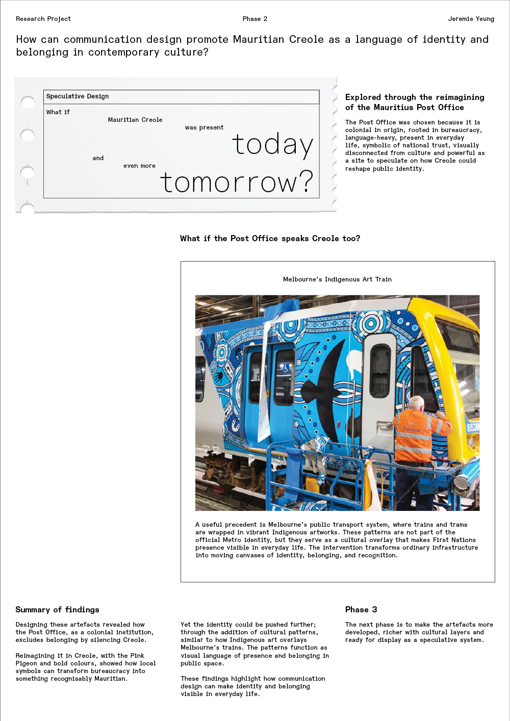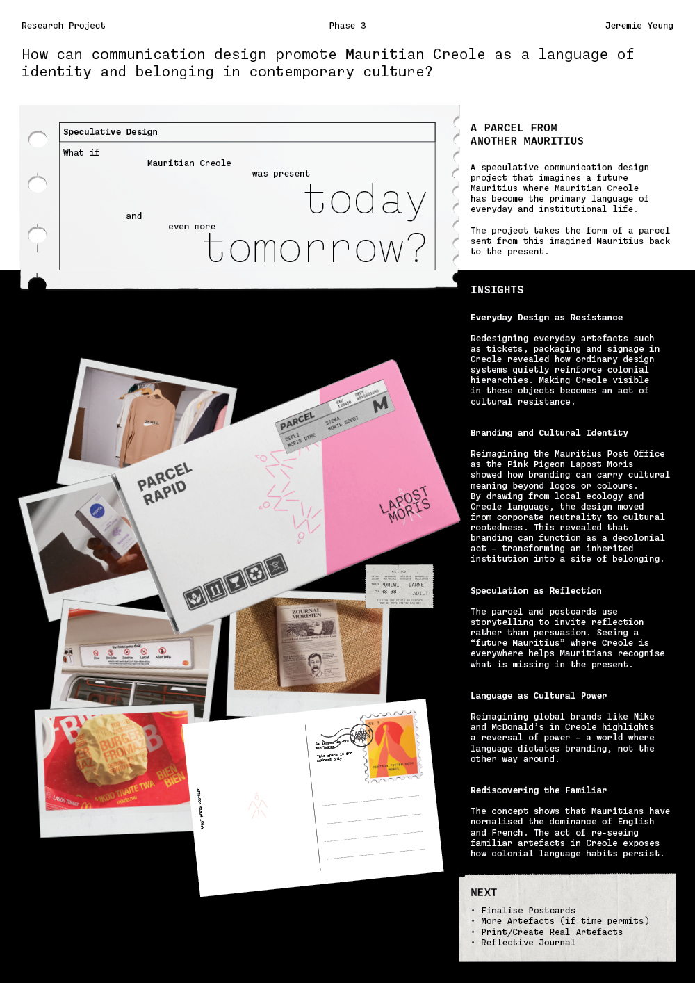 Language is never neutral. It carries histories of power, marks of identity, and possibilities for belonging. In Mauritius, Mauritian Creole is spoken by more than 90% of the population and is the language through which everyday life is lived; in homes, workplaces, markets, and popular culture. It is the code that connects communities across lines of ethnicity and religion. Yet despite this ubiquity, Creole remains marginal in the spaces that signal legitimacy: schools, government, Parliament, and public institutions. English and French, legacies of colonial rule, continue to dominate these domains. This disjuncture fractures belonging. Creole is the language that unites Mauritians in practice, but its absence from official communication renders it invisible in the structures of authority. The research question guiding this project is: How can communication design promote Mauritian Creole as a language of identity and belonging in contemporary culture? The project is shaped by both cultural urgency and personal perspective. Culturally, it responds to a paradox: Creole is the everyday language of Mauritians, yet it is absent where authority is codified. Personally, as a Mauritian designer, I have experienced this paradox directly. Creole is the language of intimacy and community, but when written or formalised it often appears informal, contested, or even illegitimate. Designing with Creole thus becomes not just a technical task but a cultural and political negotiation. The aim of the project is not to produce definitive solutions or polished campaigns but to provoke reflection on how Creole is seen, valued, and legitimised. Communication design is positioned here as a decolonial practice: a way to unsettle inherited hierarchies and make visible the contradictions that shape belonging. By working speculatively, the project stages futures where Creole is central to Mauritian identity, creating provocations that invite Mauritians to imagine possibilities beyond current exclusions. At its core, the research engages with Creole as both everyday language and contested symbol. It examines the tensions between orality and writing, the reproduction of colonial neutrality in institutions, and the potential of design to resist commodification while promoting legitimacy. Through these investigations, the project contributes to broader debates about language and belonging while demonstrating the unique role communication design can play in cultural transformation.