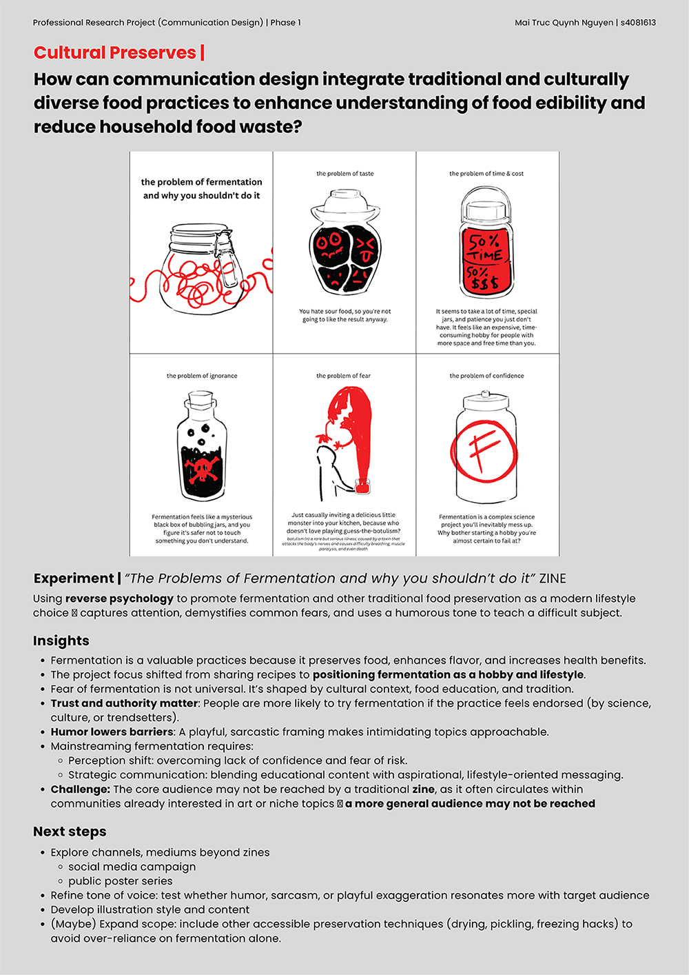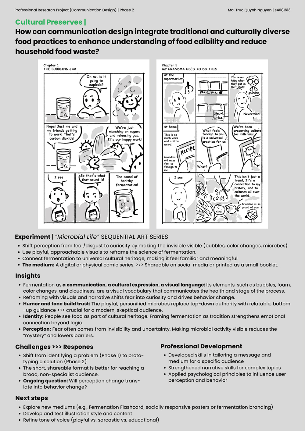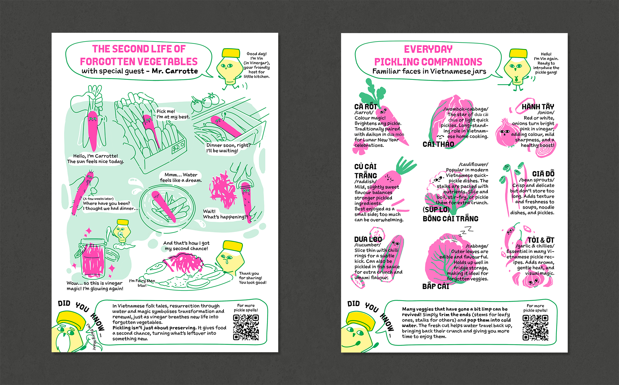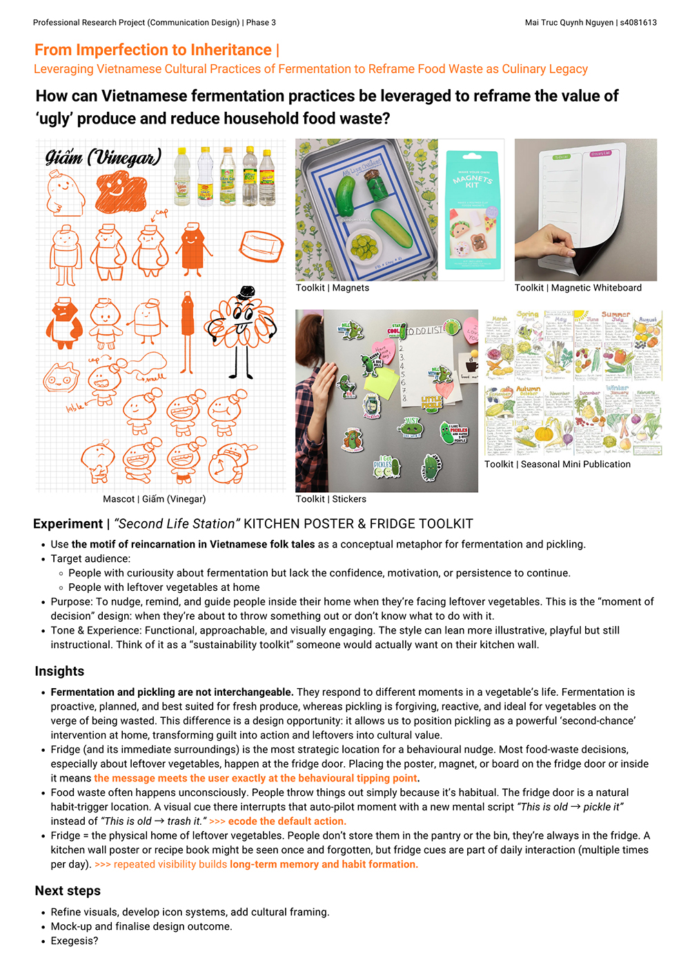 Aesthetic standards and cosmetic specifications enforced within the food supply chain are a significant cause of overall food waste. It does not only affect the moment we purchase food in the supermarket but also affects us making decisions at home. In domestic spaces, most food waste decisions, especially about leftover vegetables, happen at the refrigerator. It is where people open the fridge door and assess what is left, considering throwing something out, mentally planning meals or deciding not to cook. Pickling offers one practical solution to this problem. It transforms forgotten produce past their prime into stable, nutritious and valuable products, extending shelf life and offering additional nutritional benefits. This approach not only prevents waste but also creates new uses and value for produce that might be discarded. By giving the forgotten fruits and vegetables a second chance, pickling could encourage us to see food, from something disposable to something worth caring for and preserving. In Vietnamese cuisine, pickling is more than a food preservation technique. It is a cultural practice rooted in care, resourcefulness, and respect for food. This leads to the project's central question: How can Vietnamese pickling practices be leveraged to help global audiences rescue vegetables past their prime and reduce household food waste? The approach for this project is a design intervention grounded in culturally responsive communication. It employed a practice-based methodology combining visual storytelling, illustration, semiotic analysis, and iterative prototyping. Through these methods, I explored how communication design can shift perceptions of food value and make preservation culturally resonant for contemporary audiences. The final outcomes included the Kitchen Toolkit, a series of communication artefacts designed for household use. Together, these components aimed to visualise the “second life” of vegetables and introduce low-effort preservation cues inspired by Vietnamese pickling culture. Ultimately, this research demonstrated how communication design can translate a simple, traditional practice into a meaningful tool for reducing food waste and fostering a more sustainable, food-conscious culture.