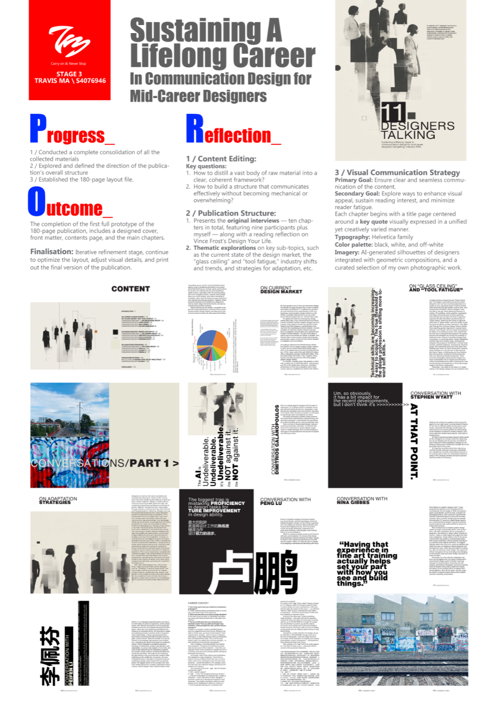 Communication design is evolving at an unprecedented pace. New tools, trends, and expectations emerge rapidly, sometimes monthly. For mid-career designers like me, this raises a critical question: how can we sustain relevance and career longevity without being rendered “outdated” or forced to restart every few years? This research develops a publication that compiles the career experiences, conversations, and reflections of 11 designers—including nine interviewees, one key precedent, and myself—to explore strategies for building long-term career sustainability in communication design. By engaging with professionals who have navigated diverse industrial and cultural contexts, reflecting on my own 15-year career across branding agencies in China, real estate marketing strategy, and Australian print production, and analyzing broader industry patterns, I aim to uncover approaches that help designers leverage their core expertise while navigating evolving expectations. The publication also seeks to articulate principles for identifying high-value skills beyond trend-chasing, understanding deeper industry patterns, and constructing resilient career identities.