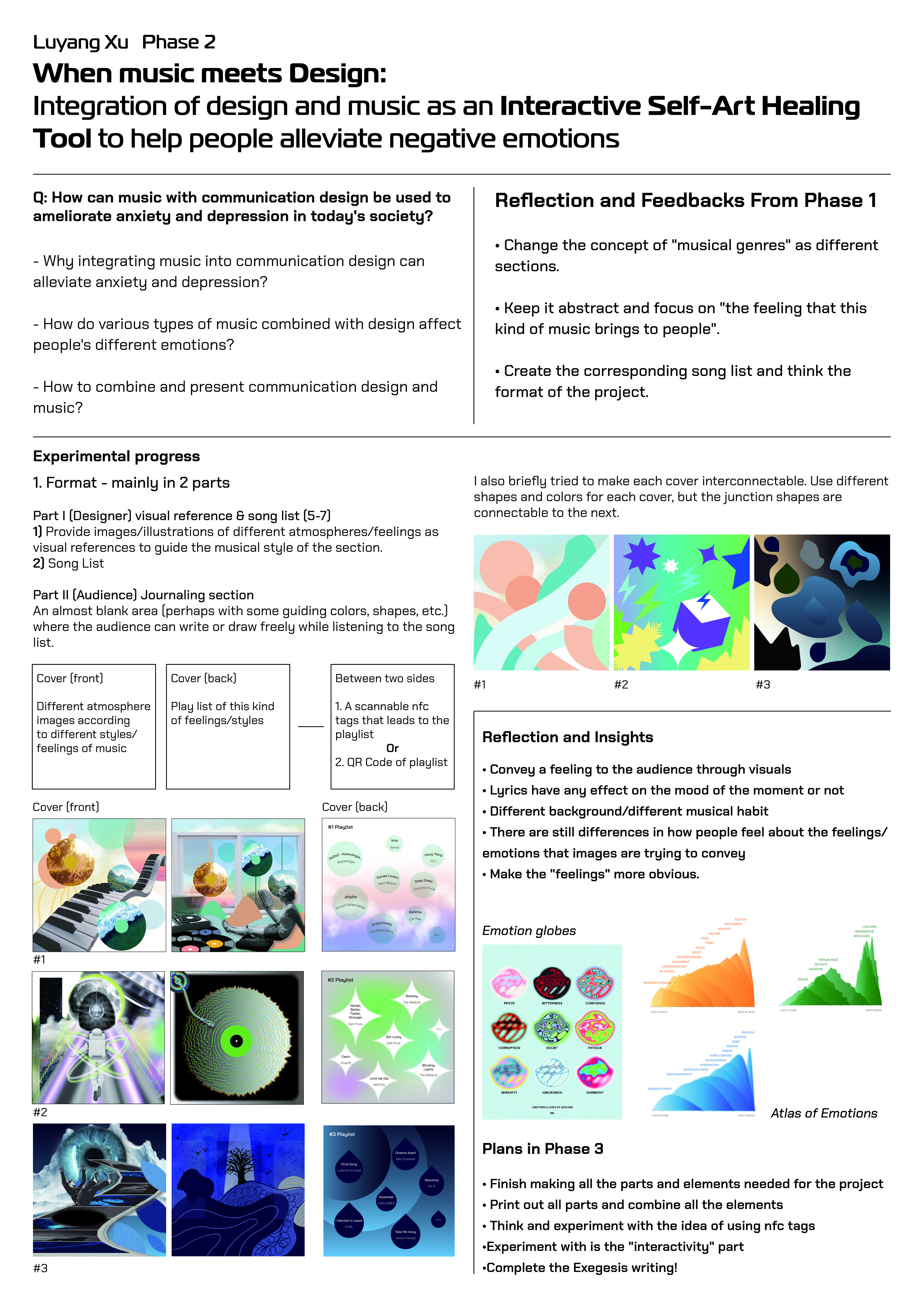Today, more and more people are experiencing anxiety and depression for a variety of reasons. These issues do not just refer to major psychological or mental illnesses but are negative emotions that most people will encounter and need to address in their daily lives. The question of how to effectively alleviate and enhance people's emotions is one that needs to be considered and is the subject of my research project. The aim of this project is to explore the connection between music and emotions, and through integrating it with design, discover and investigate how to express and display it in a way that can enhance emotions and alleviate negative feelings.