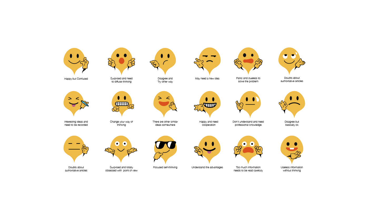 This foundation of this research question is how to induce users to engage in active critical thinking. Visual language is more easily accepted and understood by users, emojis as a part of visual language. In the case of dialogue, emojis are widely used to express human’s emotion, which greatly enriches the representation of plain text. Thousands of emojis are developed on social media every day, which makes emojis have a huge impact on daily life. As the design continued to deepen, I also found other problems, so that I had to change the direction of the design.